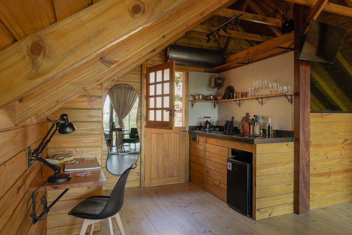 Chalé Céu da Colina – Refúgio com vista da montanha ao mar. Localizado no Sítio Vale Encantado, Palhoça–SC, a 1 km da BR-101, em estrada de chão tranquila. Situado na cobertura da pousada, é ideal para casais e oferece uma vista deslumbrante. Ambientes: hall de entrada, área home integrada, cozinha completa e sacada com balanço. Comodidades: banheira aquecida com vista, roupas de cama e banho, telescópio e lareira externa. Próximo a cachoeira e às principais praias da região sul.