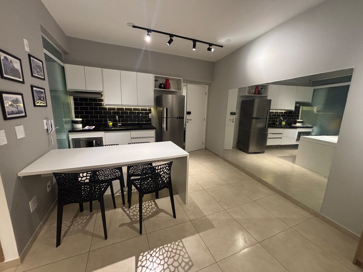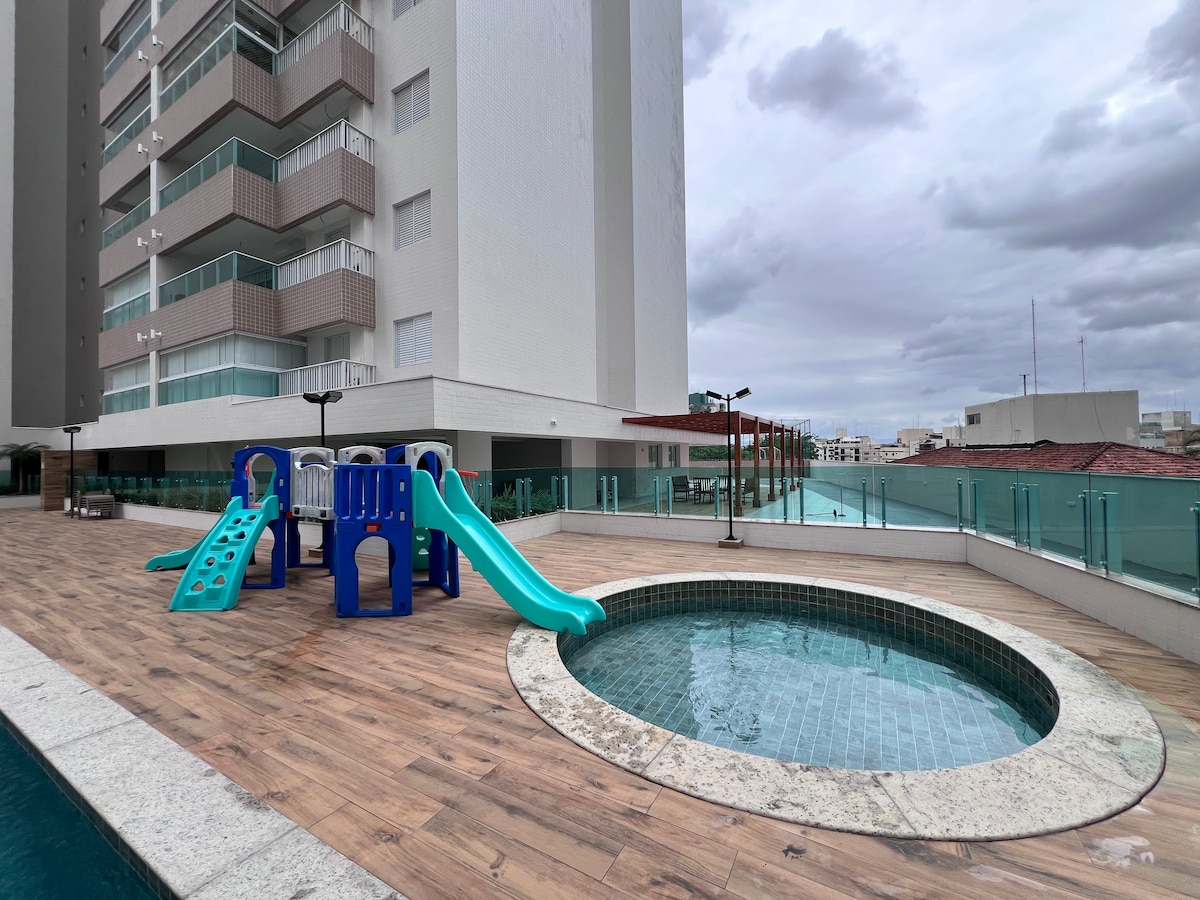 Experimente o conforto e luxo no nosso condomínio novo de alto padrão. Acomoda até 4 adultos e 1 criança (até 10 anos) com todo o conforto: uma cama, um sofá-cama super confortável e um colchão infantil. Desfrute de uma varanda gourmet com churrasqueira elétrica perfeita para momentos de lazer. Aproveite todas as áreas de lazer, mercadinho interno, garagem, Wi-Fi e nosso espaço é Pet Friendly! Venha viver uma experiência inesquecível!