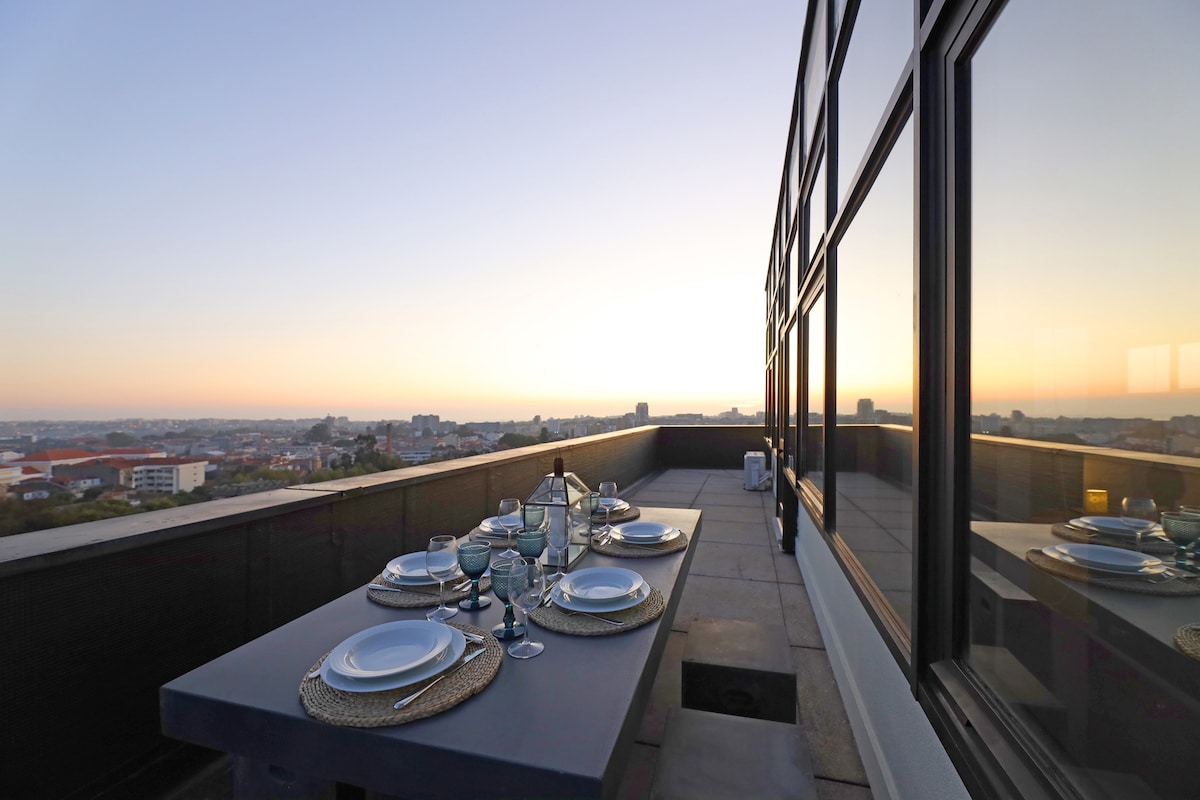 Stunning penthouse with a 100 square meters balcony with unique views over the city! Inside 2 rooms, 2 bathrooms, kitchen and a lovely living room with a comfortable sofa bed. Free parking, garage, is also included! The apartment is located in the city center, 5 minutes walking to the main metro station, trindade, and Aliados Avenue. Beside the apartment you can find a supermarket, pharmacy, restaurants and a very nice garden.