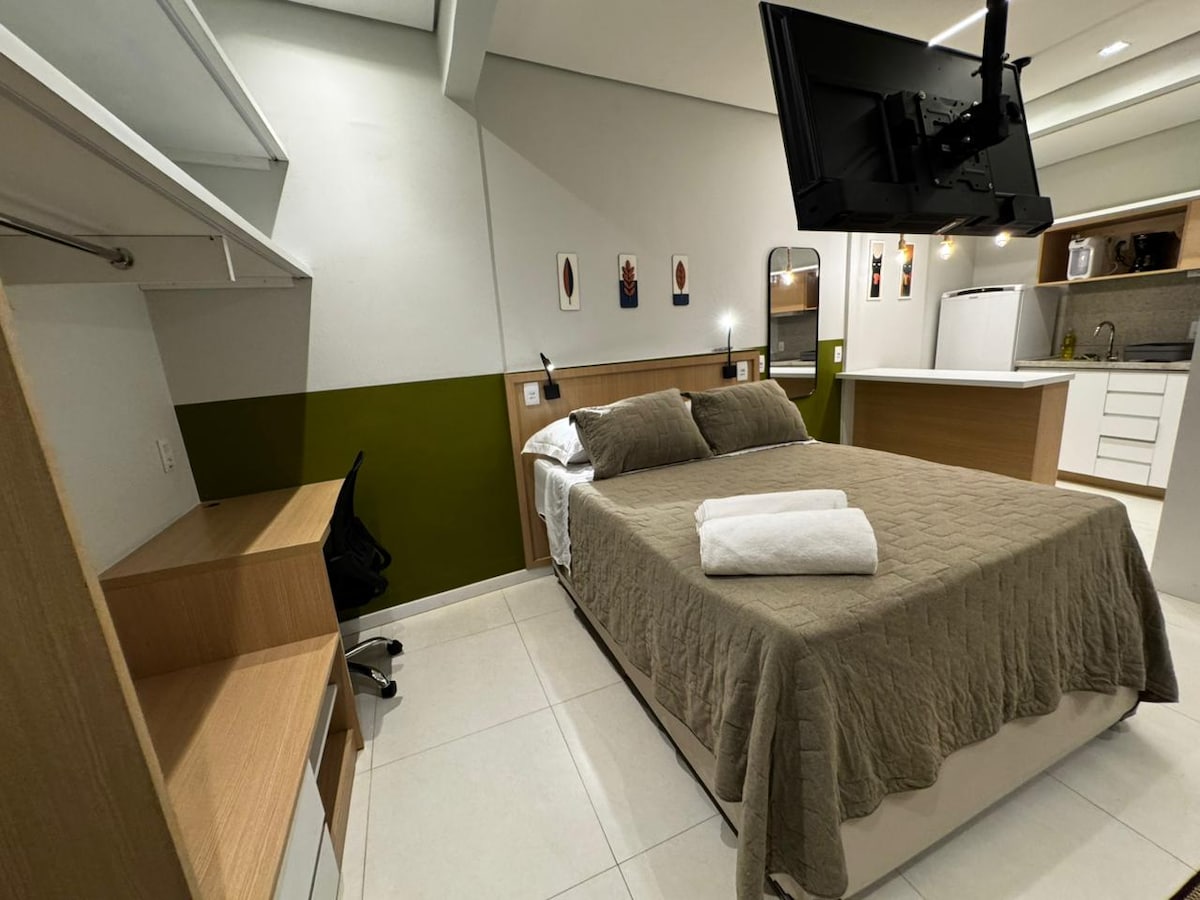 Stan nudi: • 1 spavaća soba s bračnim krevetom • Klima-uređaj u spavaćoj sobi i dnevnoj sobi • Wi-Fi od 500 mega Smart TV sa Netflix-om, Globoplay-om i Amazon Prime-om • Trpezarijski sto sa dve stolice • Potpuno opremljena kuhinja (Nespresso, sendvič, minibar) • Kupatilo (fen za kosu, sredstva za higijenu) • peglanje odjeće • ¥ Mašina za pranje i sušenje veša • Dnevna soba sa kaučem koji se nalazi na ulici hotela Fasano.