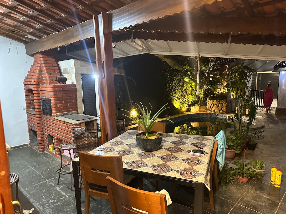 Ova elegantna kuća je potpuno nova i savršena za grupna putovanja. Nalazi se ispred prelijepog trga u Vili Tupi Praia Grande, manje od 300 metara od plaže. Bazen sa vodopadom i ogroman gurmanski prostor sa roštiljem na ugalj. Trpezarija i dnevna soba i 2 klimatizovana apartmana. Automatska i prazna kapija za 2 automobila. Hotel prima 9 osoba. Wi-Fi. Udaljen je samo 2 bloka od Av. Kenedi, sa kompletnom komercijalnom infrastrukturom. Sve možete da uradite pješke. Udobnost i sadržaj. Verisure Alarme.