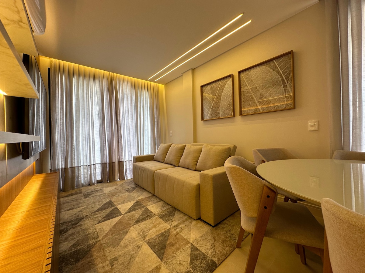 Apartamento de alto padrão localizado no Centro de Itapema, a aproximadamente 100 metros da praia e do calçadão. O imóvel possui 3 suítes climatizadas, acomodando confortavelmente até 6 hóspedes. Todos os quartos contam com camas confortáveis e TV. • 3 suítes com ar-condicionado • 3 camas queen e 2 camas de solteiro • sala ampla com TV • cozinha completa com ilha • água quente a gás • área de serviço • 3 vagas de garagem AO LADO DO MADERO E POSTO DE COMBUSTIVÉL. FRENTE A RUA PRAIA 161