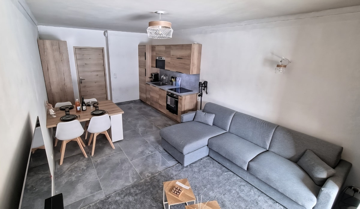 Uživajte u ovom šarmantnom i toplom novom stanu od 29 m2 , potpuno opremljenom, u mirnom prizemlju planinske kuće. Dobro uređen, veoma je funkcionalan. Do skijališta možete doći besplatnim ski liftom udaljenim 100 m. Nalazi se na početku mnogih pješačenja. Možete da uživate i u bašti sa zadivljujućim pogledom na planine i da uživate na natkrivenoj terasi za opuštanje!