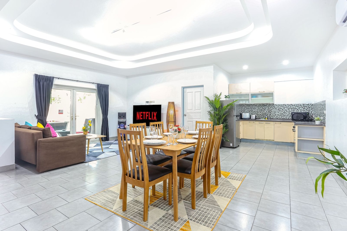 Kombinujući privatnost, praktičnost i moderan dizajn, ova luksuzna vila za odmor ima 3 spavaće sobe, 2 privatna kupatila i WC za goste. Potpuno opremljena kuhinja u evropskom stilu, veliki frižider, ugrađena rerna i mikrotalasna rerna. Gornji sprat je kao zasebna studio soba, odlična za nezavisne goste. Ovo je idealan smeštaj za odmor za male grupe i porodice i lako može da primi 8 osoba. Sto za bilijar i zvučna kutija za karaoke za vašu rekreativnu upotrebu.