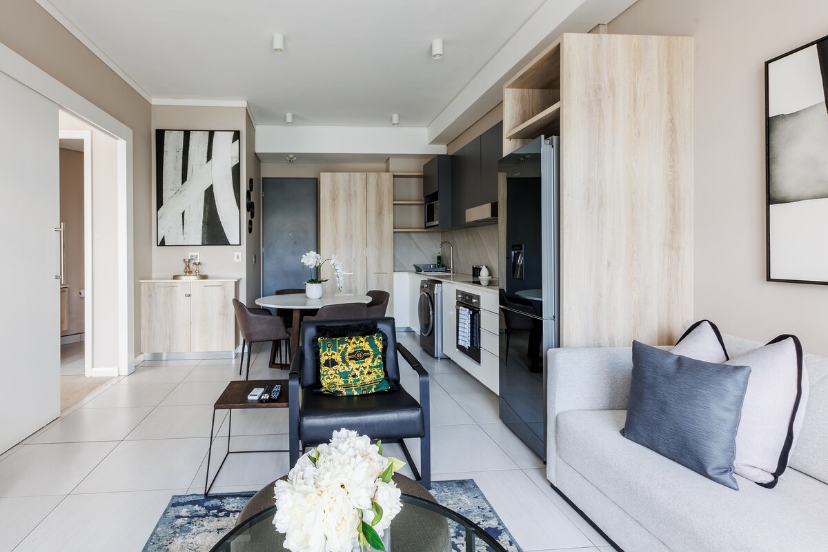 Experience modern, stylish comfort in our 56m² one-bedroom, one-bathroom apartment in Bryanston. Designed to accommodate up to two guests, the apartment features a bedroom with a queen bed, a bathroom with a walk-in shower, and an open-plan lounge and dining area, Air Conditioning and small balcony. Fully equipped designer kitchen allows for effortless self-catering, Smart TV, with access to Netflix, DSTV, Showmax, and Amazon Prime Video ready (Own Login).