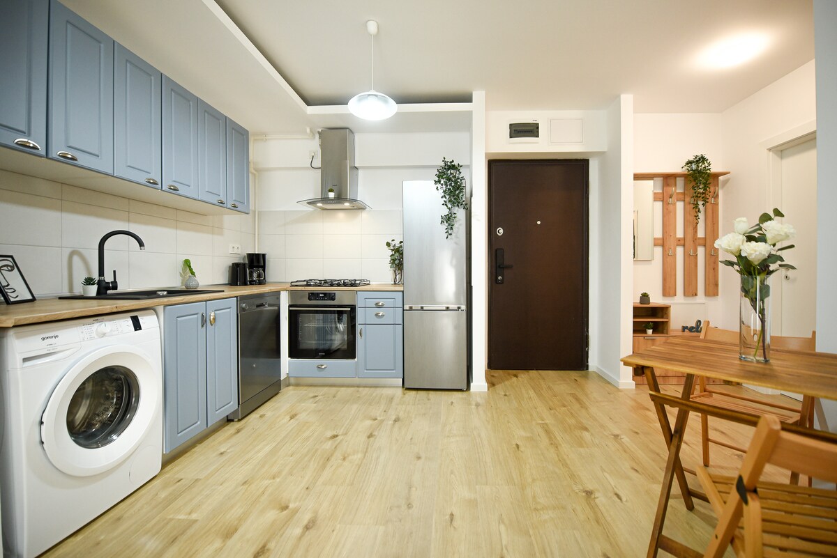 Ovaj topli i svijetli dom nalazi se u novom i modernom stambenom kompleksu koji nudi bezbjednost i stalni prijem. Parking mjesto u podzemnoj željeznici zgrade. Prostor: - jedna spavaća soba sa bračnim krevetom - dnevni boravak sa sofom na razvlačenje - Netflix i Wi-Fi - Kuhinja sa šporetom, rernom, frižiderom, mašinom za pranje sudova, mašinom za pranje veša, aparatom za espreso - kupatilo sa kadom i fen za kosu - klima-uređaj u svakoj sobi - Pegla i daska za peglanje -kuhinja je potpuno opremljena