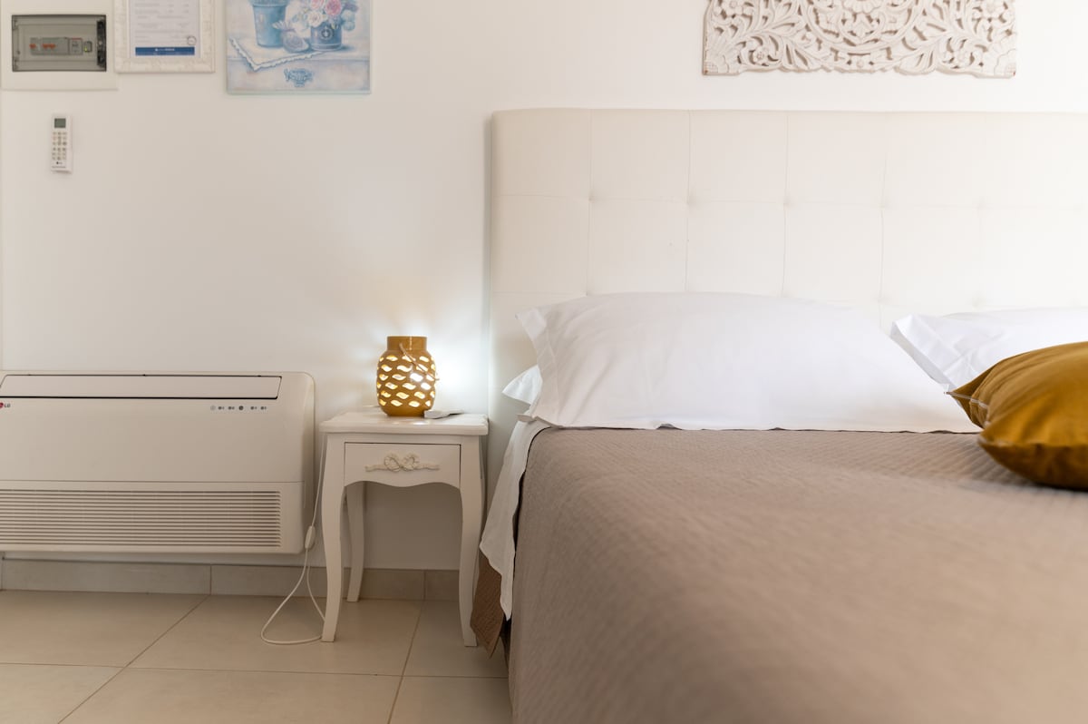 Questa camera racchiude al suo interno un gioiello di relax, un rifugio perfetto per una coppia che cerca un soggiorno sereno e rilassante. L'arredamento è un omaggio alla bellezza naturale della Puglia, con tonalità morbide e tocchi di raffinatezza che creano un'atmosfera accogliente.All'interno, troverai un angolo relax dove potrai ritagliarti del tempo solo per te. Al centro della stanza, il letto king size troneggia maestoso, pronto ad accogliere il tuo riposo dopo una lunga giornata.