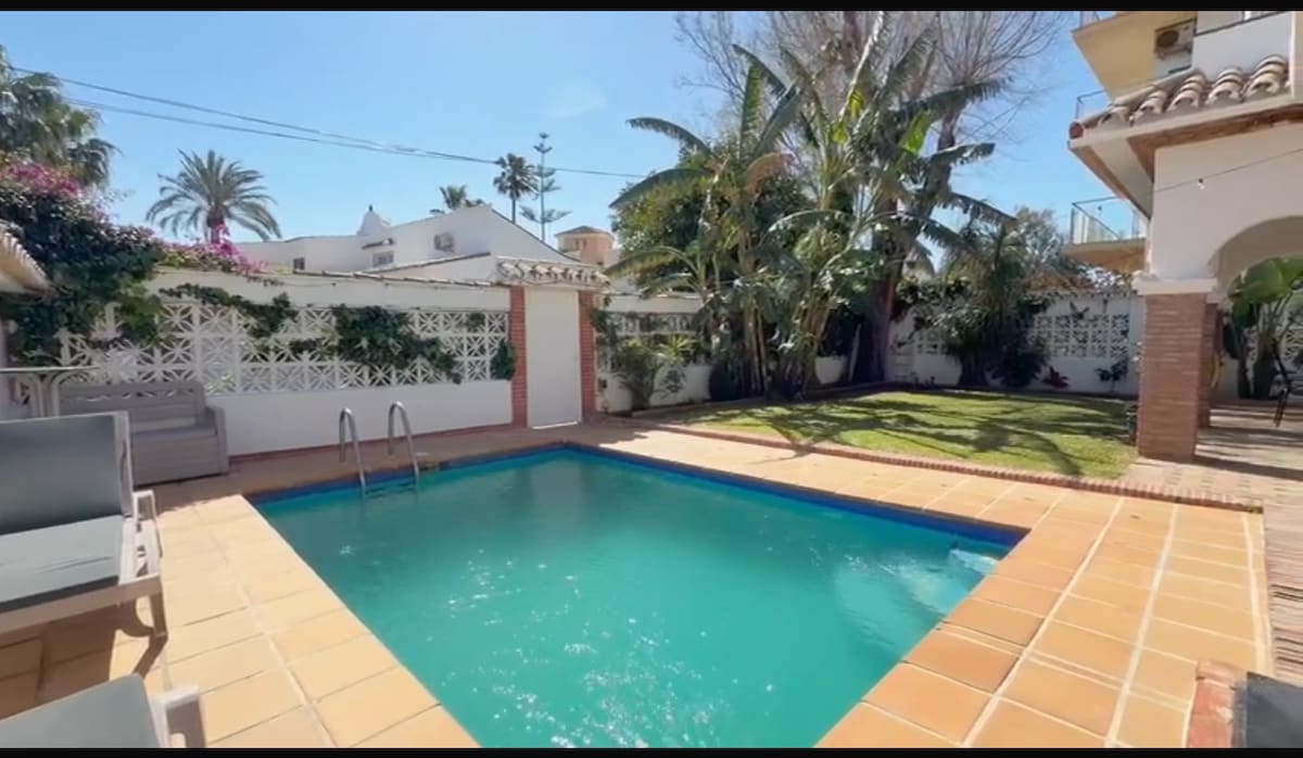 Prelepa vila na najboljoj lokaciji u Marbelli: 4 minuta vožnje ili 20 minuta hoda do Puerto Banusa i njegove prelepe plaže, 100 metara od velikog supermarketa Mercadona i mnogih restorana i pabova, a pored autobuske stanice. Privatno i mirno, ima baštu i bazen sa lepim pogledom na okolne planine. Uređena je ukusom i svim sadržajima koji su vam potrebni, savršena je za porodice ili grupu prijatelja. Kauč na razvlačenje omogućava da 9. osoba spava ako je potrebno.