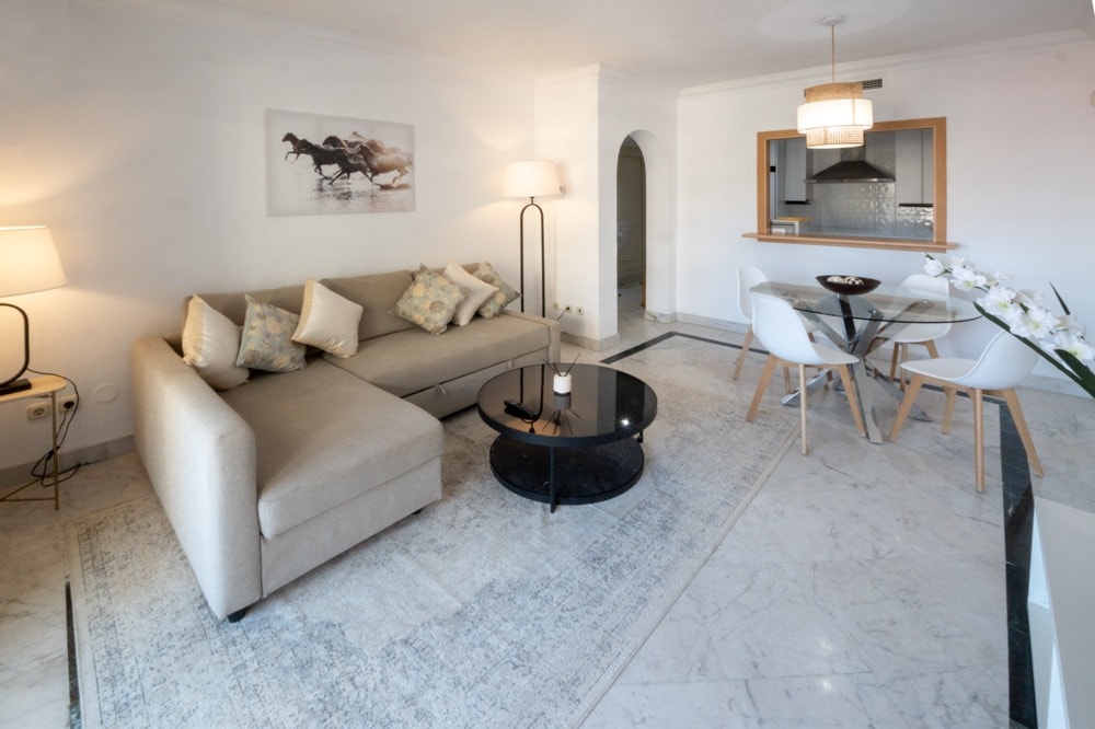 This spacious and bright 60m2 studio has an extra-large double bed, a comfortable italian sofa bed, a furnished terrace, a kitchenette and a private bathroom. In addition, among its equipment, the free Wi-Fi connection, 50" SmartTV, a safe, dressing table and all the details of the kitchen area with crockery, microwave, refrigerator, dishwasher, electric hob and extractor. This modern apartment is located inside a 4 stars Hotel in Puerto Banus which was totally renewed on 2023