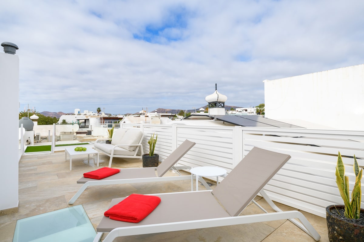 Tradicionalna kanarska kuća sa svim trenutnim sadržajima. U mirnom području u srcu Puerto del Karmen. Pet minuta do plaže, kupovine i večere. Sa delimičnim pogledom na more, ostrvo Lobos i Fuerteventura.