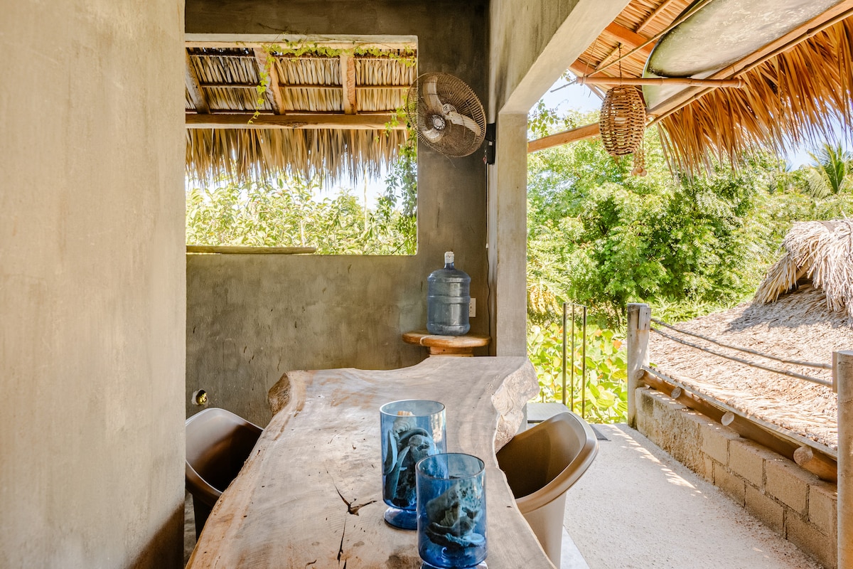 Depa amplio y luminoso en planta alta con 2 camas queen súper cómodas, A/C en la recámara y ventiladores en sala y cocina. Cuenta con cocina equipada, salita acogedora y balcón con vista a palmeras. Estás a solo 2 min de la playa y a 1 min de cafés, tiendas y restaurantes. Disfruta el patio compartido con hamacas, árboles frutales, asador y área de pesas artesanales. Ideal para relajarte, surfear o trabajar remoto con buena vibra. 🌴