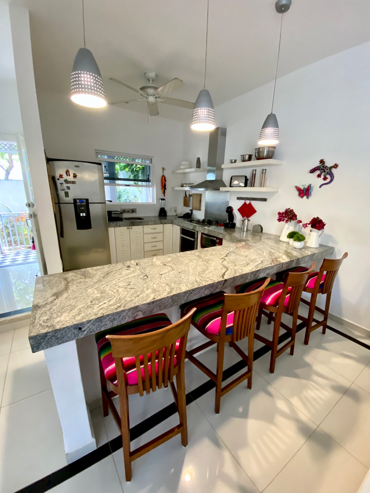 Naš smještaj ima 3 spavaće sobe i 4 kupatila, veliku baštu s bazenom i balkonima koji nude privatni prostor za svaku sobu. Casa Ilusions se nalazi u rezidencijalnom području, samo 100 metara od jedne od najljepših plaža na La Rivijeri i četiri bloka od srca Puerto Morelosa gdje možete uživati u širokom spektru restorana. Ako ste ljubitelj ronjenja ili ronjenja s maskom i disalicom, želite da znate da će vam drugi najveći koralni greben na svijetu biti na dohvat ruke.
