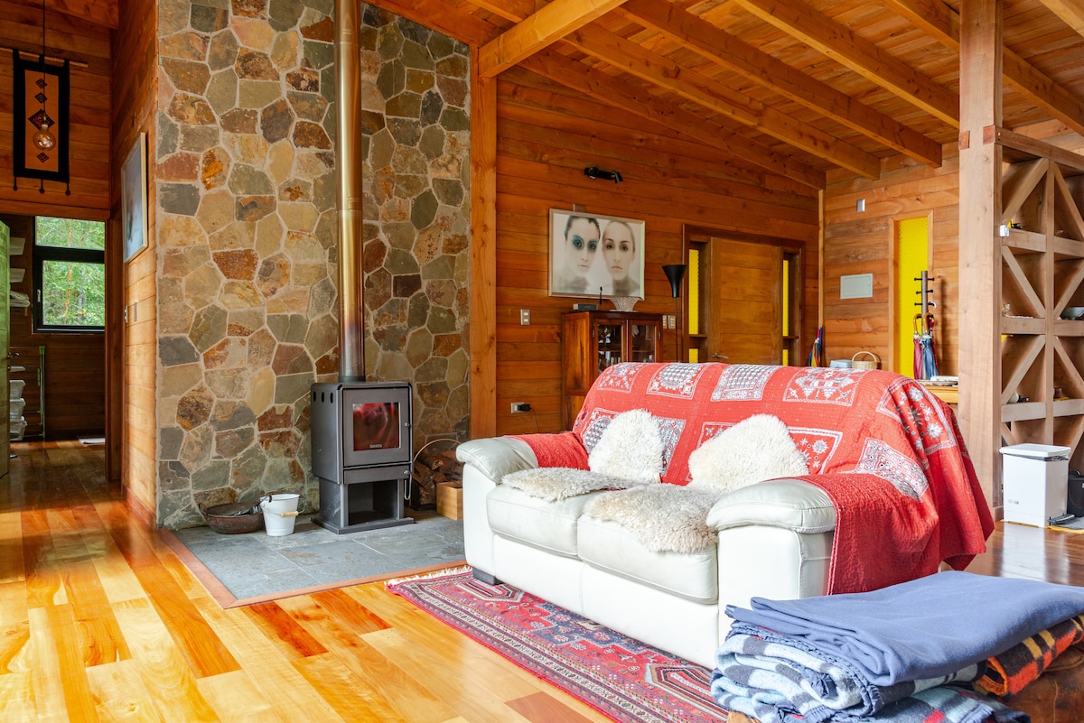 Opustite se u ovom jedinstvenom i mirnom smještaju s veličanstvenim pogledom na vulkan Villarica. Pristup svim vrstama vozila. Brvnara je nova i veoma kvalitetna, opremljena svime. Njihov boravak uključuje korišćenje naše privatne saune u šumi pored potoka. Lokacija je udaljena 18 km od Pukona, 1 km od Ojos de Caburgua. To je savršeno mjesto za uživanje u čistoj prirodi, uključujući više od 25 vrsta ptica. Takođe je idealan za bijeg od grada i rad na daljinu.