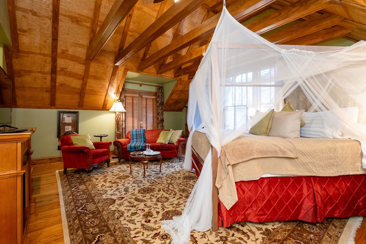The Hemingway Spa Suite is a bold king retreat in the Carriage House at The Empress of Little Rock. Inspired by the spirit of the 1940s, the suite features vaulted ceilings with rough-hewn beams, a fireplace, separate sitting area, garden balcony, and a spa bath with Jacuzzi, steam shower, and footbath. A distinctive and indulgent escape with character and warmth.