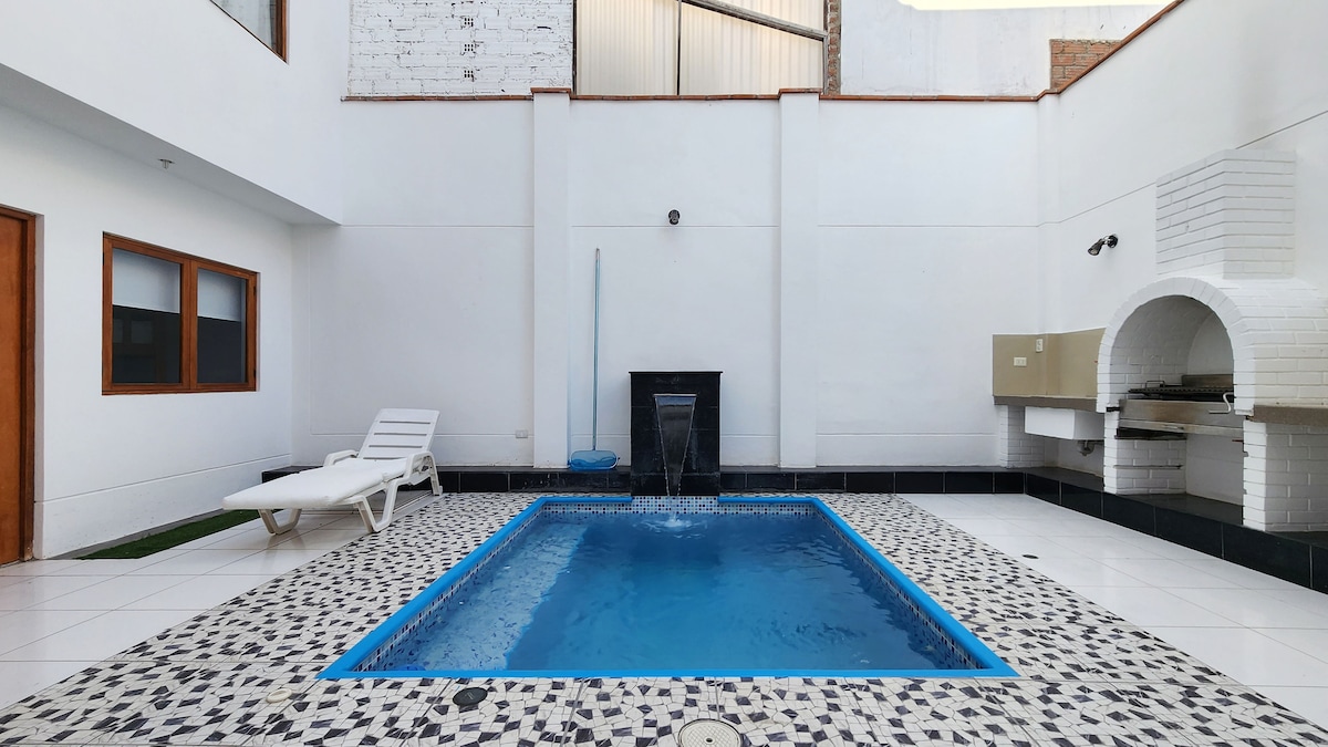 Uživajte u savršenom odmoru u ovoj udobnoj kući na plaži, samo 40 minuta južno od Lime. Idealno za porodice i grupe prijatelja. Nalazi se u blizini plaža Los Pulpos i El Silencio, na nekoliko minuta hoda. Samo 3 minuta od novog C.C. KM40 i 10 minuta od PUNTAMAR-a. Potpuno opremljena kuća za 5 osoba, sa velikim društvenim prostorom koji omogućava više gostiju (terasa i bazen), spavaća soba, dnevna soba, kuhinja, vešernica i drugi. Ima WI-FI i ClaroVideo.