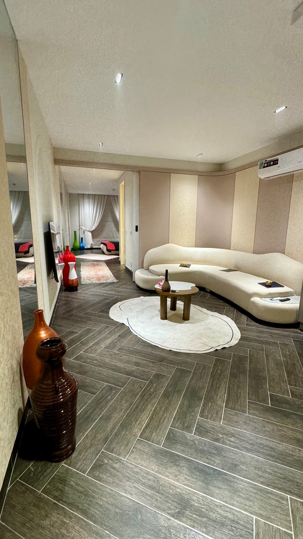 Our 1 BHK Orbit Penthouse in DHA Phase 5 is where urban chic meets celestial cool. Think: a glowing moon wall for those late-night selfies and a bold dollar-stacked art piece that screams "main character energy" Wake up to park views from your private balcony swing, binge your faves on the 50" 4K Smart TV, or cook up something aesthetic in the fully loaded designer kitchen. The interiors? Abstract, stylish, and made for the feed. Plus, you're right next to Lahore's hottest dining spots.
