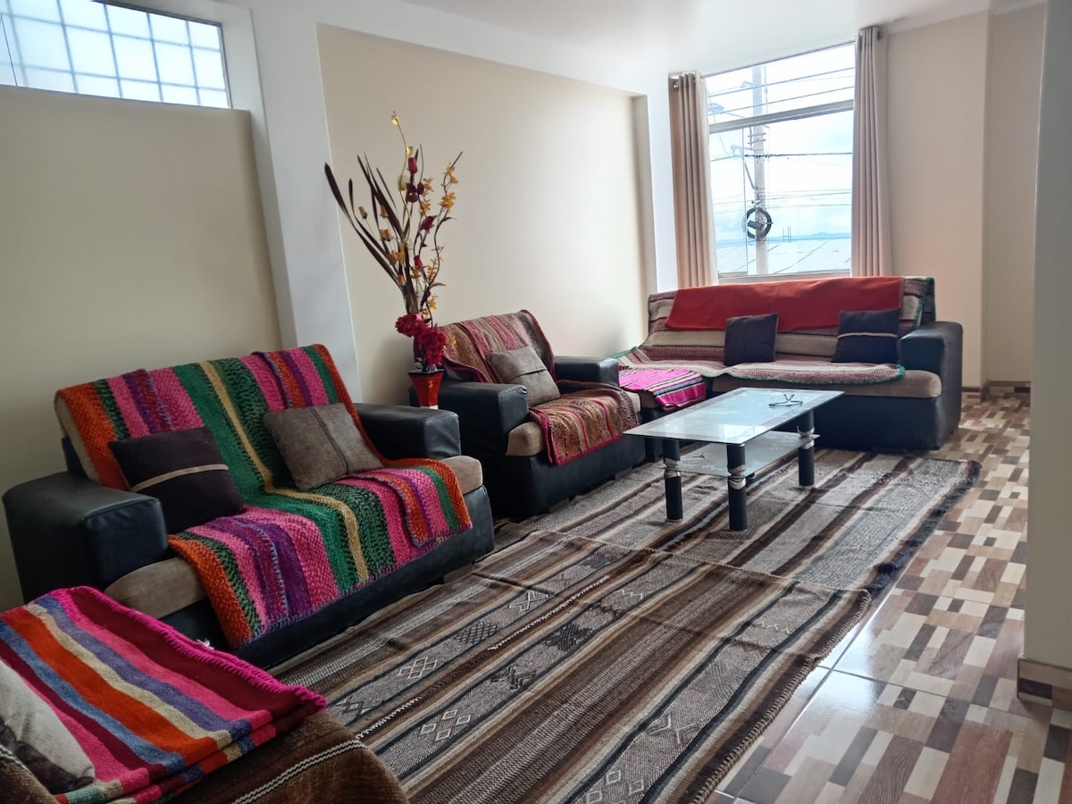 Departamento, a 2 CUADRAS DE NUESTRO LAGO TITICACA, LA PLAZA, la casa esta ubicada hacia la calle, en el segundo piso de la avenida principal de nuestra ciudad, son ambientes, acogedores y sobre todo seguros, con vista al lago y a la ciudad desde la sotea de la casa, te ofrecemos cable y wifi durante tu estadía. se encuentra cerca a los principales lugares turísticos de nuestra ciudad, lugares a los que puedes acceder caminando, contamos con cámaras de seguridad.