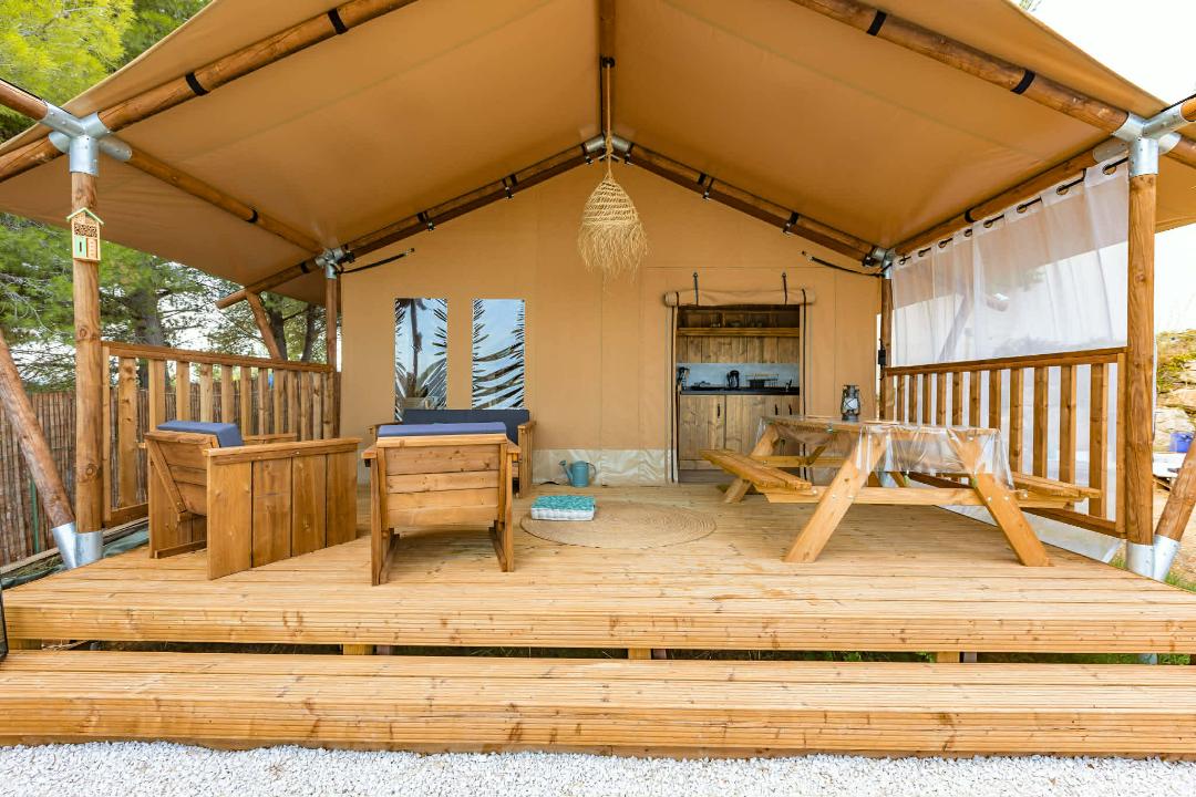Each tent has its own place with beautiful views. Go camping with the luxury of an apartment; two bedrooms with real beds with good mattresses, a room in the middle with a kitchen on wheels so you can cook outside and a seating area. On the covered terrace you will find a table with chairs and 2 lounge chairs.
