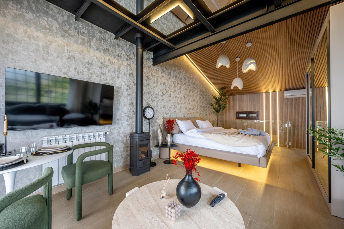 U prostoriji se nalazi svjetlo kao voda, a zidovi bež boje upijaju dan. Vatra svijetli nisko, više dah od plamena. Zelene baršunaste stolice sjede u mirnoj misli, ušuškane u uglove napravljene za usporava. Ništa ne traži pažnju. Sve ga nudi. Kupatilo se otvara kao tišina: čista, neizgovorena. Cijeli pogled od 360° okružuje prostor, sa pogledom na planine sa terase i jasnim pogledom na more sa balkona. Ovdje tišina nije odsustvo. Radi se o dizajnu. Prostor za koji se može osjetiti, a ne djelovati.
