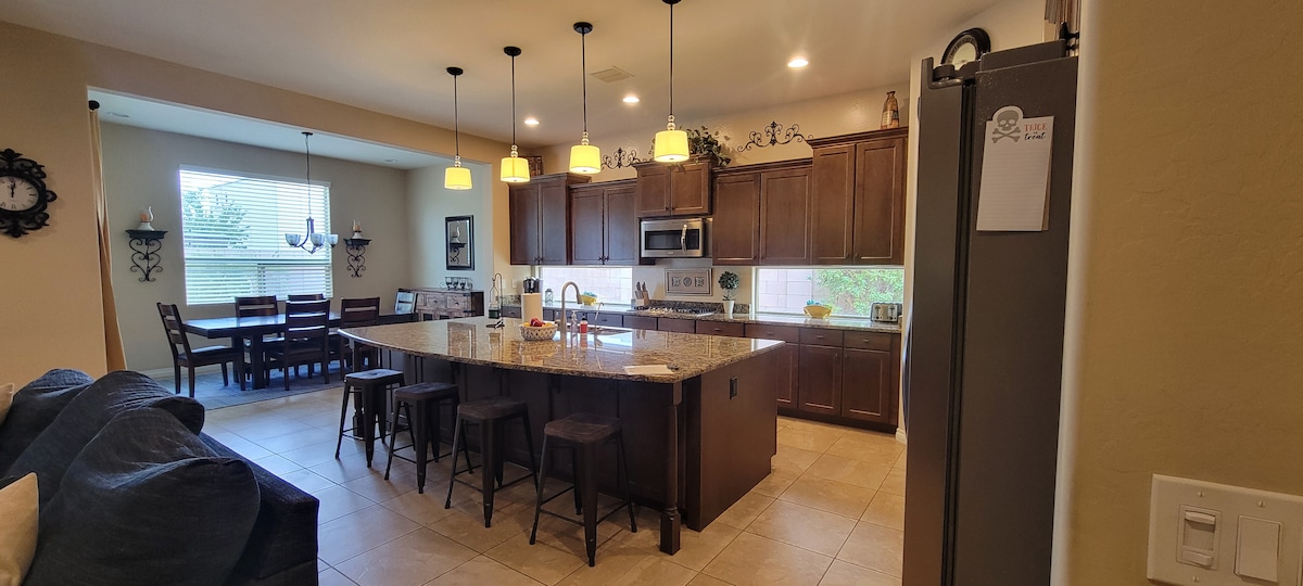 Prelep dom sa 5 spavaćih soba / 3 kupatila i grejanim bazenom koji se nalazi u centru pored bukvalno svega. Udaljen je samo kratka vožnja do centra Kvin Krika, Gilberta, parkova, sportskih kompleksa i još mnogo toga. Vaša porodica i grupa prijatelja će imati ceo dom za jednu porodicu (na 1 sprat) u nizu samo za sebe. Kuća se nalazi pored parka Desert Mountain i pored terena za odbojku na pesku. Imamo sve što vam je potrebno. Spa centar/bazen se greje tokom hladnijih meseci. :-)