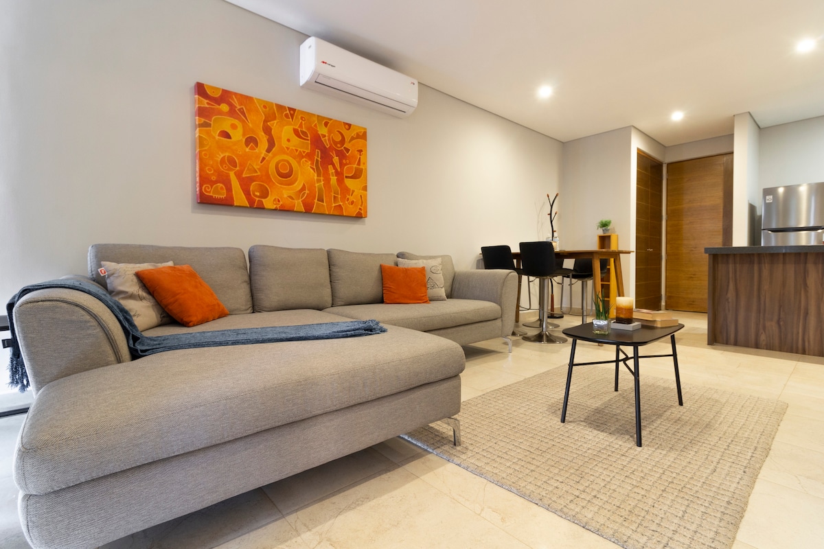 Budite iznenađeni prostorom koji inspiriše. Ovaj stan sa privatnom terasom nalazi se u kondominijumu tipa odmarališta sa više od 30 sadržaja: bazenom, đakuzijem, veslačkim tenisom, prostorom za roštilj, spa centrom, bioskopom, baštama, teretanom i još mnogo toga. Sa modernim dizajnom, jedinstvenim dekorom i prijatnom atmosferom, idealan je za opuštanje, rad ili uživanje sa stilom. Savršeno za porodice, parove, grupna putovanja ili duže boravke. Rezervišite sada i počnite da uživate čim stignete!