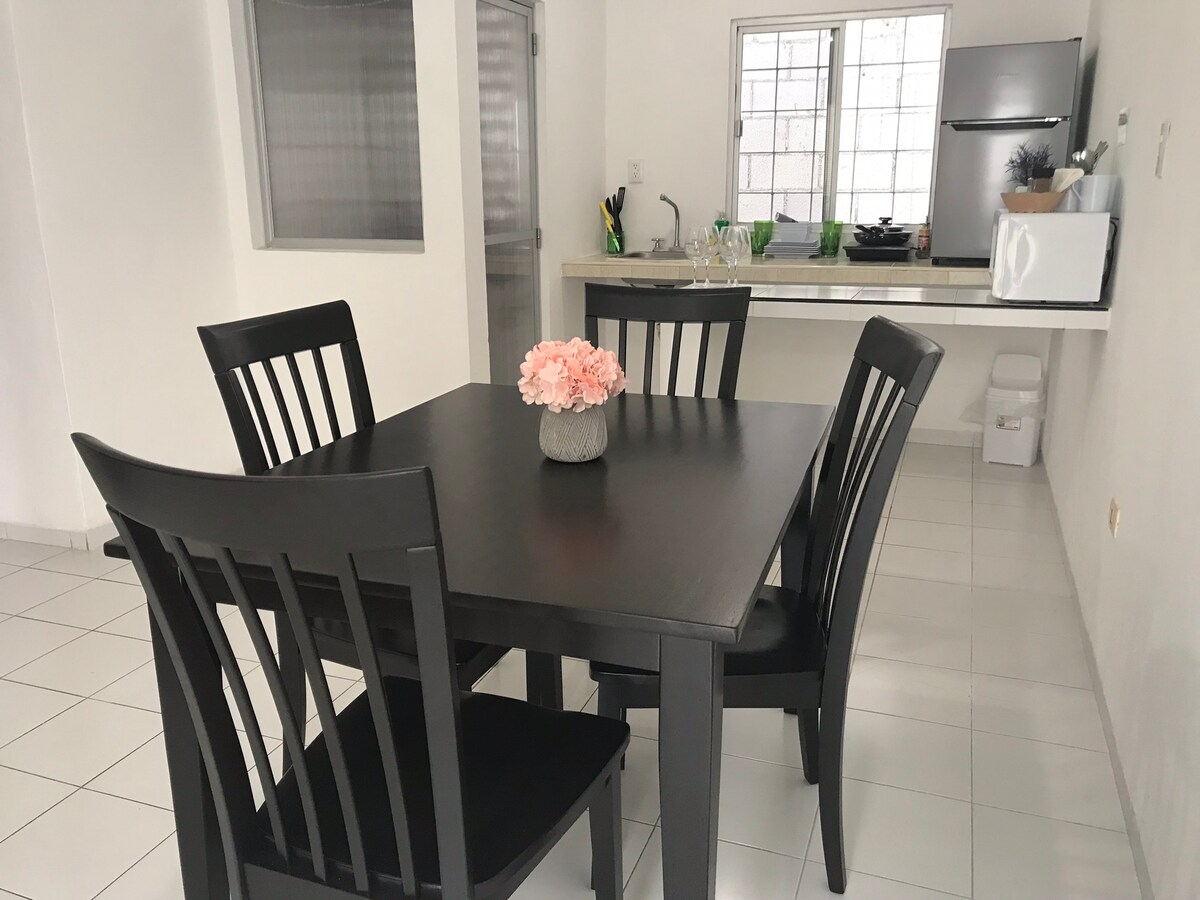 Apartment Loft style (40 m2) in closed complex ( of 5 apartments in total). The Apartment has social space, small kitchen with basic things to cook, upstairs 1 bedroom with great beding, 1 bathroom. The space its ideal for 2 people but we have an sofa bed we can comfortably take 3 people. Parking space inside teh property. 10 minutes away by car from Paseo de Montejo and Centro, and 10 minutes away fron the north of the city. Great connection with circuito. Parque de la Aleman 2-3 blocks away.