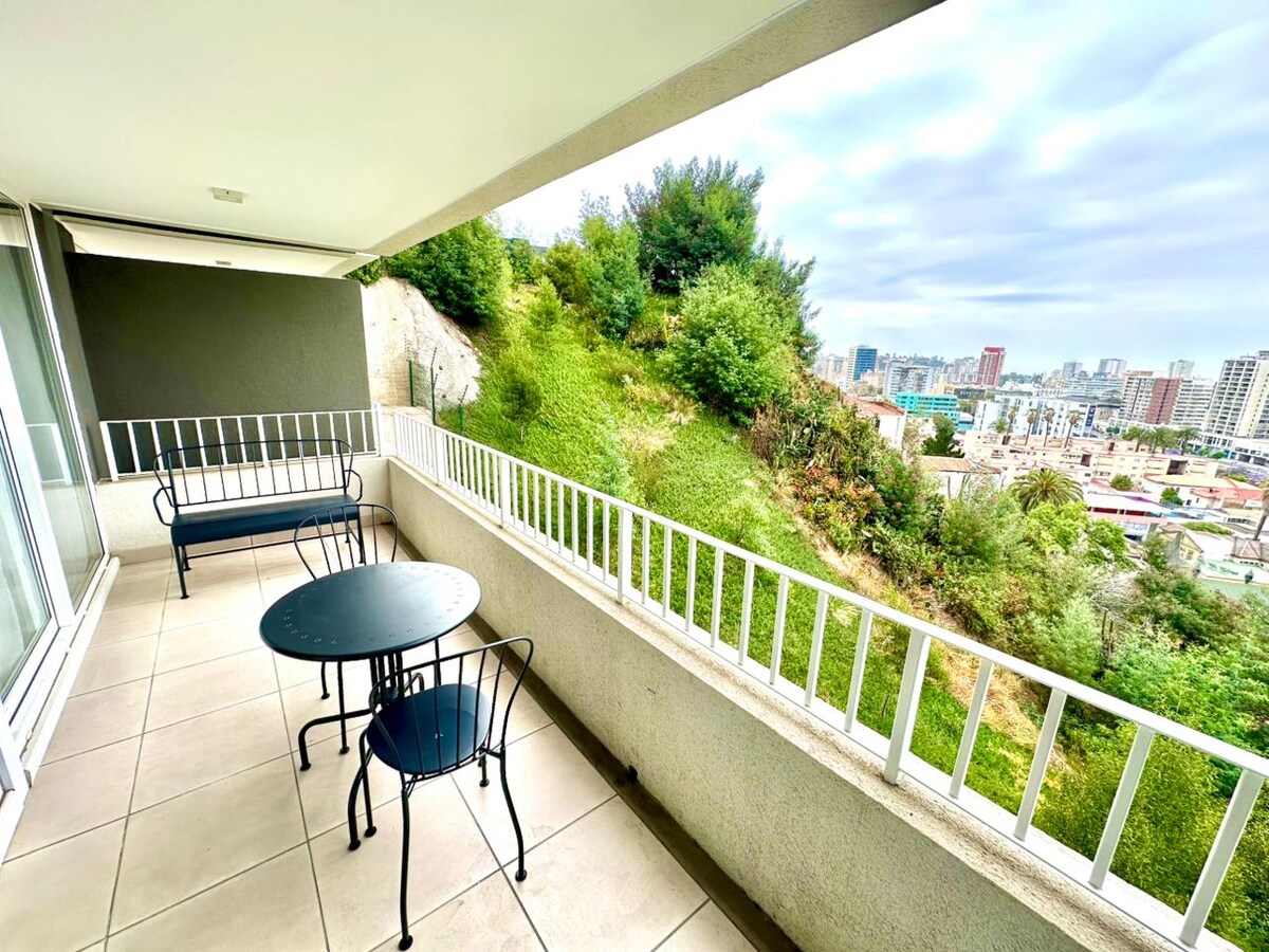 Uživajte u jedinstvenom iskustvu u ovom neverovatnom stanu sa odličnom lokacijom i privilegovanim pogledom na zaliv i Seros de Valparaiso. Udobno namješten i opremljen stan. Ima 2 spavaće sobe i 2 kupatila , jedan spojen sa sobom, integrisanu kuhinju / dnevni boravak i terasu. Stan uključuje parking.