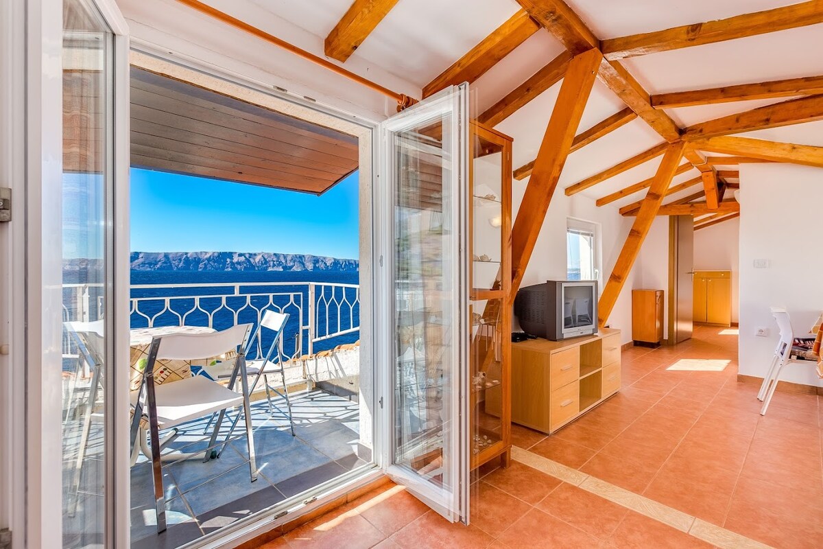 Apartman se nalazi u obiteljskoj kući na prvom katu s posebnim ulazom. U njemu se nalaze dvije spavaće sobe s tuš kupaonicama i balkonima koje gledaju na more. Dnevni boravak je smješten ja sjevernoj strani zajedno sa kuhinjom i terasom. Apartman je novo uređen i klimatiziran te svega 80 m od plaže i mora.