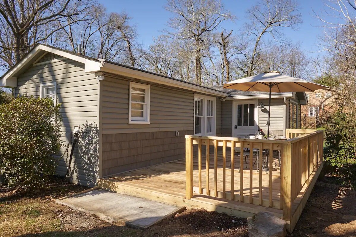 This 1921 bungalow is 15 minutes from downtown Chattanooga, Rock City, and Ruby Falls yet with a rural wooded feel. Redesigned and renovated with new furnishings and appliances make your stay comfortable and worry-free. One queen bedroom with a large window overlooking the back deck; a living room with a seasonal wood-burning fireplace, queen sofa bed, and vaulted ceiling make this tiny bungalow feel spacious, airy, and light-filled. Kitchen and dining area are fully equipped for longer stays.
