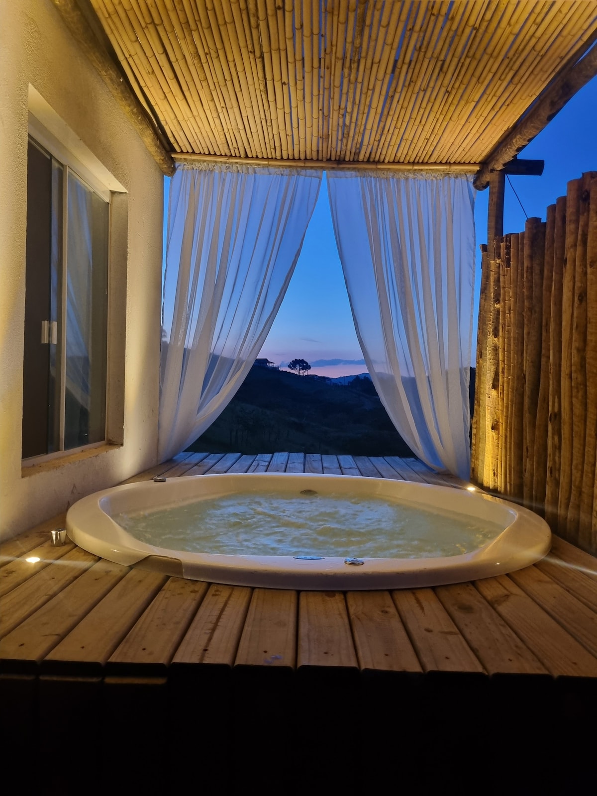 Cabana com jacuzzi e vista infinita para a represa, ideal para relaxar em meio à natureza com total privacidade e segurança. Perfeito para casais, oferece deck com vista deslumbrante, por do sol incrível e céu estrelado. Desfrute do canto dos pássaros e da tranquilidade ao acordar. Localizado em uma marina náutica com restaurante e passeios de lancha, caiaque e quadriciclo a apenas 1h30 de São Paulo, com acesso pavimentado pela Rodovia Dom Pedro I. Wi-Fi, cozinha completa , ar condicionado