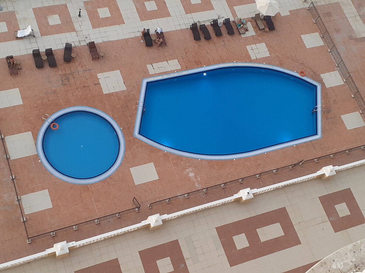 Luksuzni udobni studio sa pogledom na more i bazenom koji oduzima dah, tačno 2 minuta hoda od plaže, ima kauč na razvlačenje, sve kuhinjske aparate, uključujući odgovarajući keramički šporet i sve što vam je potrebno za opuštajući boravak sa 5 zvjezdica! Supermarket u istoj zgradi sa besplatnom dostavom .