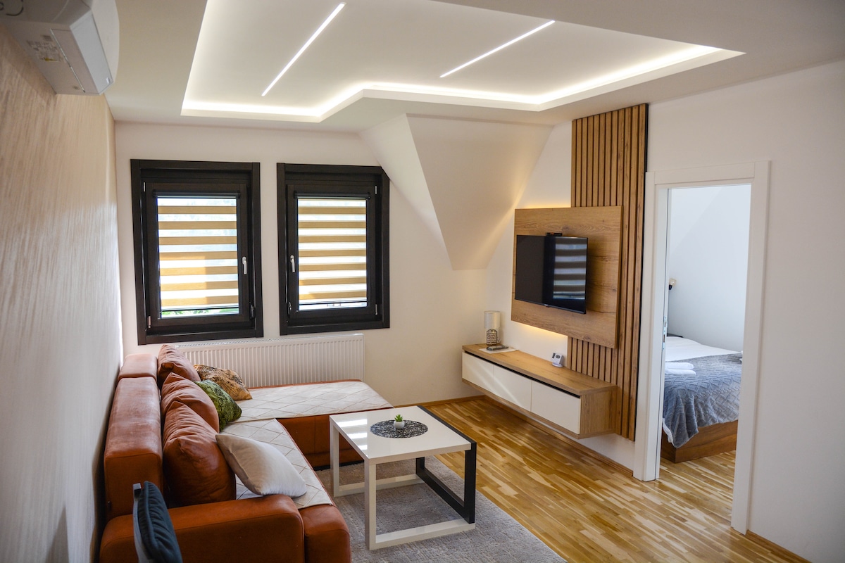 Moderno opremljena brvnara za dvoje na Mokroj Gori idealna je za romantični ili opuštajući odmor u prirodi. Kombinuje rustični šarm sa savremenim sadržajima – poseduje udoban francuski ležaj, moderno kupatilo, kuhinju sa neophodnim aparatima, grejanje i Wi-Fi. Veliki prozori i terasa nude prelep pogled na okolnu šumu i planine, stvarajući savršen ambijent za beg od gradske gužve.