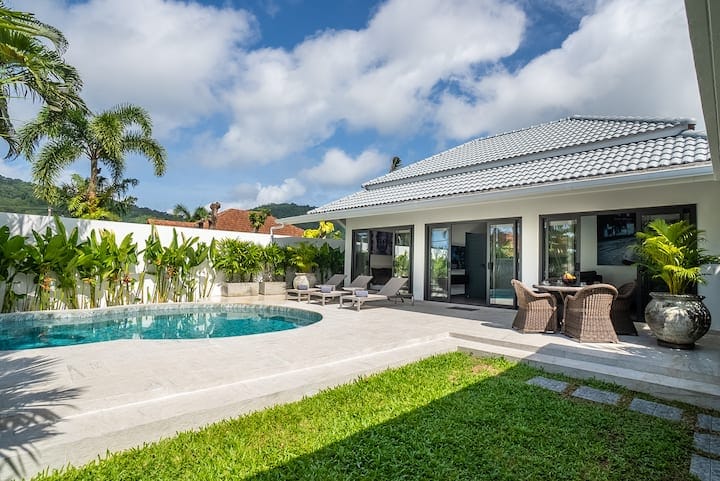 Uživajte u luksuzu u našoj novoj vili sa 3 spavaće sobe, sa zadivljujućim privatnim bazenom sa slanom vodom, upotpunjenom plažom savršenom za djecu. Smještena samo 5 minuta od plaža Rawai i Nai Harn, ova moderna vila se nalazi u privatnoj i mirnoj rezidenciji u blizini prodavnica, gdje možete pronaći restorane, supermarkete i masaže. Savršen za porodice ili prijatelje koji traže opuštanje, nudi besprekornu mješavinu luksuza i praktičnosti. Vaš odmor počinje ovde!