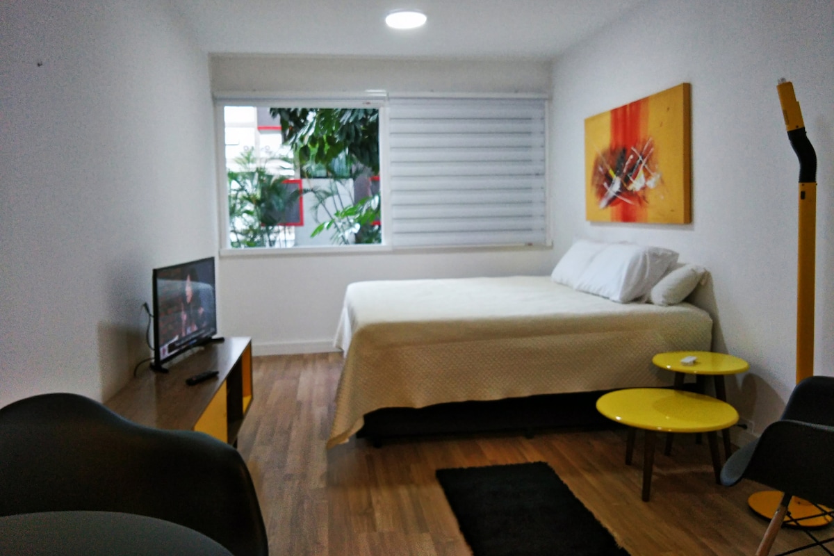 This apartment is in the best location in Jardins. In a luxurious and modern condominium close to the most famous street in São Paul, Rua Oscar Freire, close to Ibirapuera Park and 20 minutes from Congonhas Airport. -Space for work with fast Wi-Fi navigation. -Kitchen equipped with electric coffee maker. - Queen bed with premium hotel standard linen. Need to go to the market? Carrefour is next door. Do you want to have a full breakfast? There is a bakery in front of the condominium.