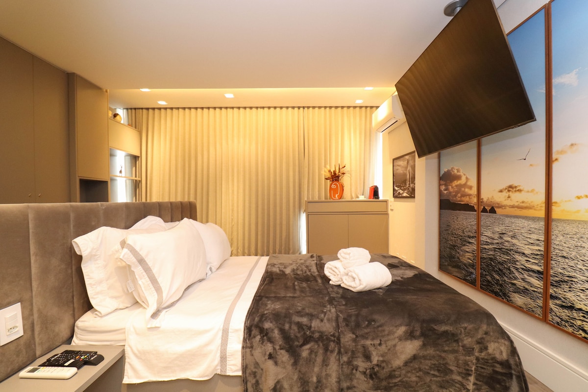 Stylish 50 m² apt. located at Bela Vista, has 24hr doorman. 2 bedrooms (only 1 with AC, and queen bed, the second one is quite small and can be used as an office, fitting a double-sized sofa-bed) and 1 bathroom. With amazing views from every window, it is a great place to work and relax. The private jet-tube at the balcony is a fantastic spot to enjoy the city views. Ideal for couples, professionals or small families looking for comfort, convenience, and one of the best views in the city.