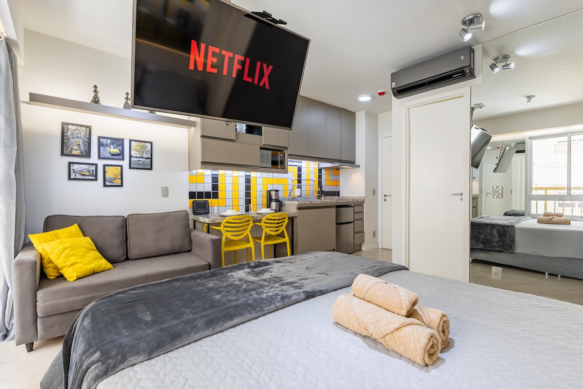 Studio extremamente aconchegante! Totalmente reformado e cada detalhe pensado com todo carinho para te receber e fazer desta a sua melhor estadia. Possui todos os itens novos para seu maior conforto: SmartTV (43 polegadas), conexão WiFi com 300Mb de velocidade, cozinha completa com geladeira, fogão de indução (com as panelas para uso), forno de microondas , cafeteira Dolce Gusto, sanduicheira, máquina de lavar roupas (lava e seca), e todos os utensílios (talheres, copos). Portaria 24hs