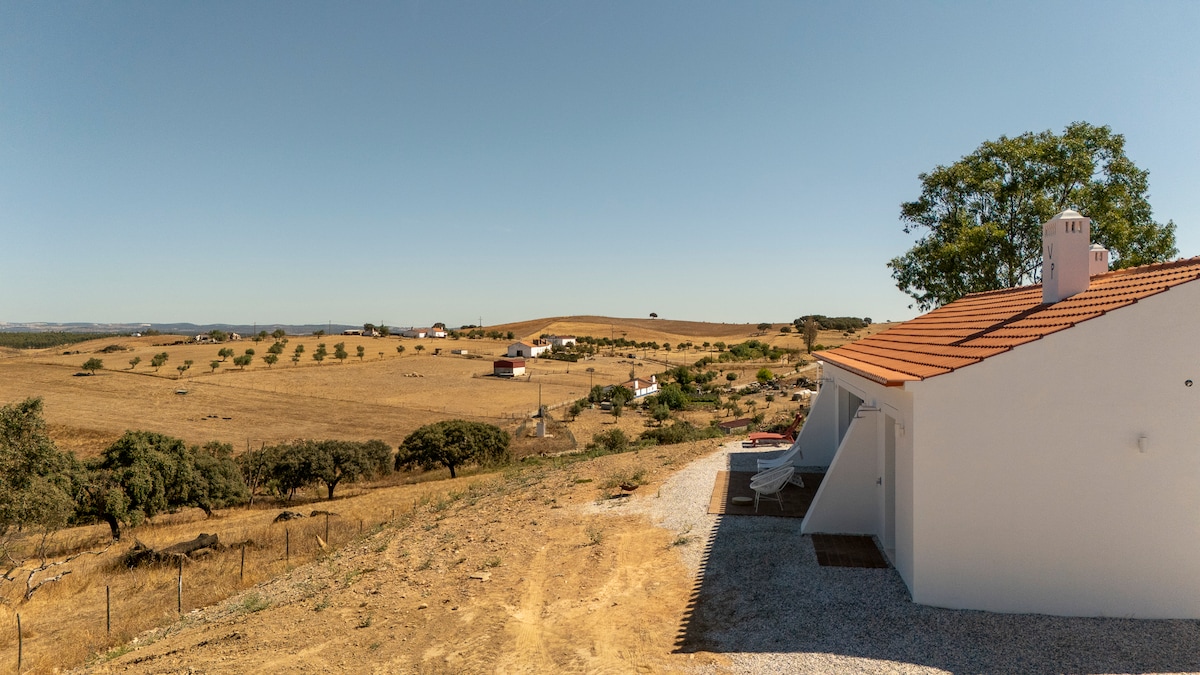 Smještena u srcu Alentejoa❤️, 90 minuta od glavnog grada i tri minuta od centra, okružena vinogradima, ova šarmantna moderna seoska kuća u starinskom stilu nudi veličanstven pogled na ravnice Alentejo, pružajući vam miran i udoban boravak sa pristupom kablovskim kanalima i besplatnim Hi-Fi, spavaćom sobom i dnevnim boravkom sa klima-uređajem i šporetom na drva. Udobna kuhinja u privatnom i prefinjenom okruženju s obnovljenim namještajem i dodacima.