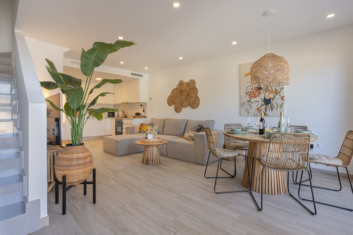 Dobro održavana privatna KUĆA od 80 m² nalazi se na mirnom imanju u uglu. Možete uživati na suncu cijeli dan, na prekrasnom imanju u prizemlju ili na veličanstvenoj gornjoj terasi za sunčanje sa domaćim zimskim vrtom. Postoji roštilj za prijatne večeri na roštilju. WI-FI U neposrednoj blizini se nalaze 2 divna ZAJEDNIČKA BAZENA. Predivne plaže su na nekoliko minuta vožnje Do raznih dobrih restorana možete doći za oko 10 minuta hoda. Supermarketi u kratkoj vožnji.