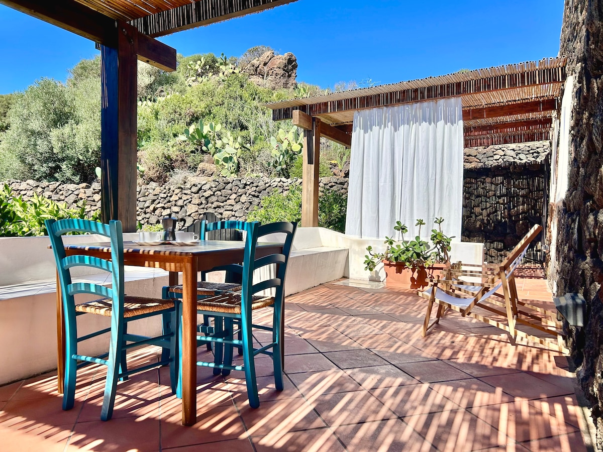Dammuso situato in zona estremamente tranquilla lato tramonto vista mare. Circondato da 3000 m di terreno coltivato , è adatto a chi cerca il totale relax lontano dai rumori della città . Ideale per due persone , gode di ottimi e ampi spazi esterni. Attrezzato con lettini prendi sole e in totale privacy . Il giardino arabo è il luogo ideale in cui trascorrere serate in un’atmosfera magica . Si può salire sul tetto per godere a pieno del paesaggio per un aperitivo mediante una comoda scala