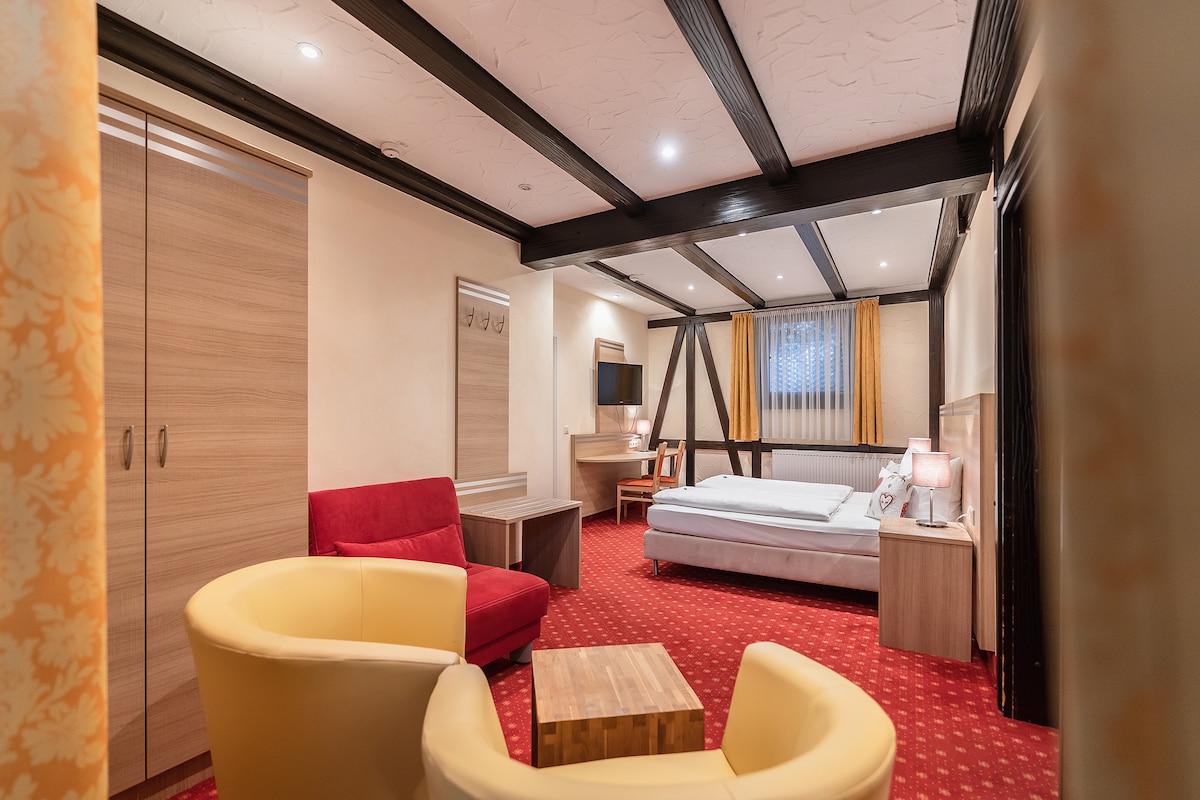Geräumiges, klimatisiertes Doppelzimmer mit Flachbild-TV, zwei bequemen Betten und Platz für ein Zustellbett – ideal für Familien oder Geschäftsreisende. Ein moderner Arbeitsplatz mit Tisch und Stuhl ermöglicht komfortables Arbeiten, das Bad mit Dusche sorgt für zusätzlichen Komfort und Erholung. Genieße unser reichhaltiges Frühstücksbuffet am Morgen.