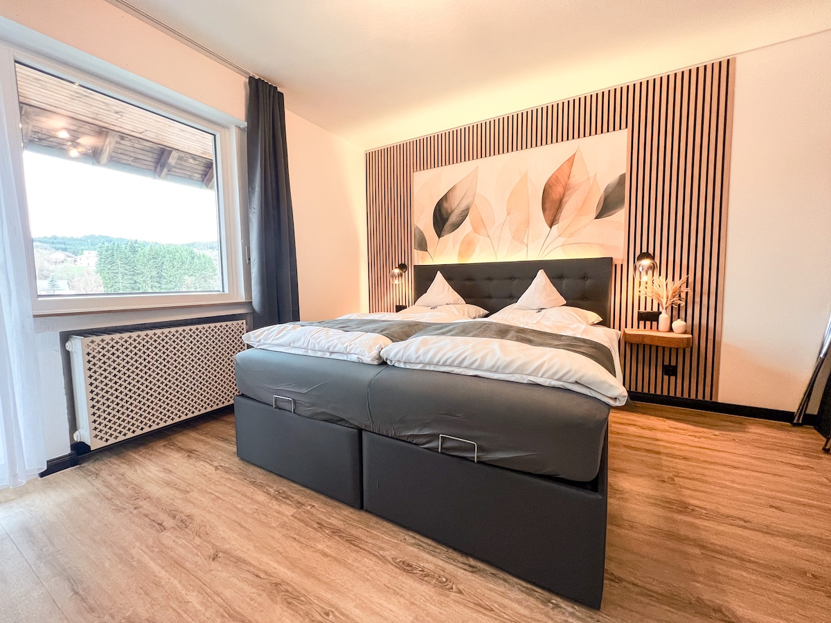 Herzlich Willkommen mitten im Nationalpark Hunsrück direkt am Wander- und Skigebiet Erbeskopf. Unsere 94qm große im Jahr 2021 komplett neu renovierte Ferienwohnung befindet sich im Untergeschoss unseres Anwesens mit direktem Gartenzugang (5000qm) und bietet allerlei Annehmlichkeiten um Ihnen Ihren Urlaub bestmöglich zu gestalten. Bitte schauen Sie vor Ihrer Buchung unter villa-vorkastell. de Hier finden weitere Informationen zu Ihrer Unterkunft uns unsere AGB. Haustiere gerne auf Anfrage!
