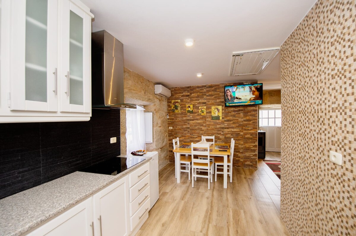 Kuća u prizemlju, 10 minuta od Santjaga (automobilom) i 20 minuta od plaže, nalazi se u prirodnom i tihom okruženju, na samo 1 km od autoputa AG-56 Santjago-Brión, što omogućava lak pristup turističkim područjima Galicije, kao i supermarketima i restoranima u tom području. Ima 3 spavaće sobe, 2 kupatila, kuhinju-dnevni boravak, zastakljenu terasu, natkriveni roštilj i baštu, potpuno opremljen posteljinom, peškirima, kuhinjskim posuđem i Wi-Fi mrežom (600 MB).