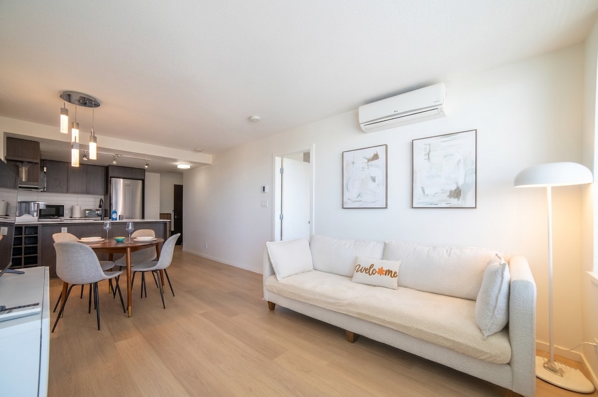 Uživajte u modernoj udobnosti u ovom potpuno novom stanu sa 2 SPAVAĆE SOBE, kao i u parkingu, pažljivo osmišljenom za besprekoran i opuštajući boravak. Zahvaljujući centralnoj klimatizaciji, prostor ostaje hladan i udoban tokom cele godine. Apartman ima glavnu spavaću sobu sa bračnim krevetom (širine 150–179 cm) i jedan odvojeni krevet koji se nalazi u radnoj sobi, pa može udobno da primi najviše tri gosta. Na idealnoj lokaciji u srcu Vankuvera, bićete na samo nekoliko koraka od najpopularnijih atrakcija kao što su Fols Krik, Sivol, Olimpijsko selo, Geztaun i centar Vankuvera.