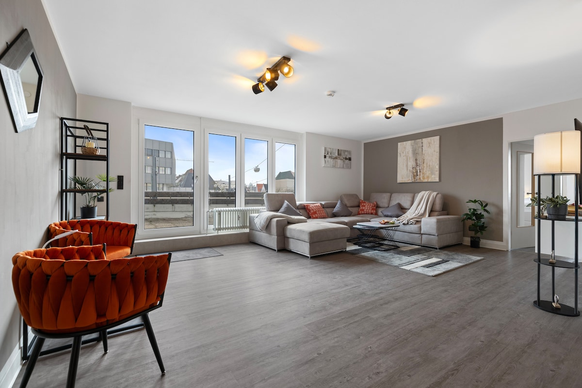 Diese stilvolle Unterkunft eignet sich perfekt für alle Reisenden die gerne komfortabel auf 102 qm Wohnfläche mit Terrasse "relaxen" möchten. Das große Wohnzimmer mit Esstisch (7 Personen), toller Wohn-/Schlafcouch und 65" 4 K TV lädt zu geselligen Abenden gerne ein. 2 (Kingsizebett) + 1 (Einzelbett) in Boxspring Hotelqualität + die ausziehbare Schlafcouch bieten erholsamen Schlaf für bis 7 Gäste. Größere Gruppen können unsere Flat Relax-Home "A" 92 qm/7 P. im gleichen Haus separat dazubuchen.