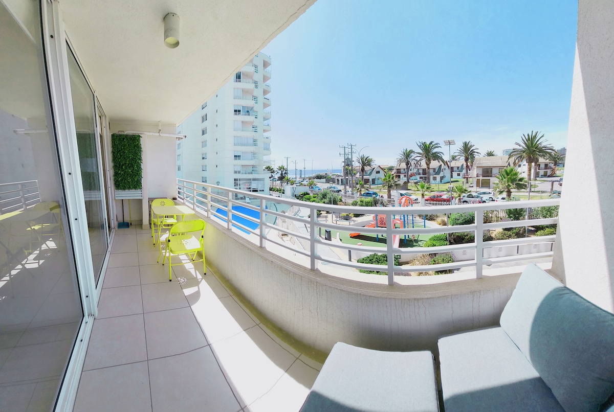 Pobjegnite u Coquimbo! Udoban stan za 5 osoba ispred plaže, sa 2 spavaće sobe (bračni krevet, brvnara i kauč na razvlačenje), potpuno opremljenom kuhinjom, Wi-Fi mrežom, mašinom za pranje/sušenje veša, 24-časovnim nadzorom, privatnim parkingom i liftom (13. sprat). Nalazi se samo 2 bloka od tržnog centra Vivo, Centro, supermarketa, autobuske stanice, uvale, pored lokalnog sajma i aktivnosti kao što su vožnja gusarskim brodom. Idealno za opuštanje, uživanje u moru i istraživanje područja. Rezervišite smještaj i doživite doživljaj!
