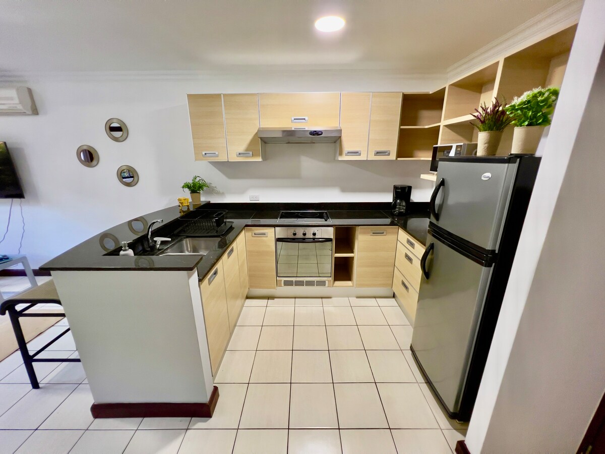 Beautiful 1 bedroom apartment on 2 floor, a / c, elevator, finely furnished and equipped. Excellent location within condominium with 24/7 security, swimming pool, gym, jacuzzi, play for children, private wifi and in common areas. Excellent for executives, couples, facilities for babies (crib and high chair) and pets. Stop bus and supermarket 100mts, restaurants, banks, City Place Mall and other attractions walking distance. Forum at 5min., Multiplaza and Av. Escazu at 10min.