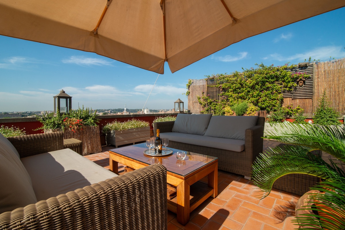 - Panoramic loft in one of Rome's best streets just a few steps from Piazza di Spagna. - Just steps away from the main sightseeing hotspots. - Extremely well positioned and connected to all major transport systems. -Gym a few steps away. - Electric window shades. - Very quiet. - Design furniture and accessories. - Very safe. - Large windows. - Sunny terrace with large sofas and dining table. - Chair lift for luggage. - Possibility of hiring a private driver to and from the airport.
