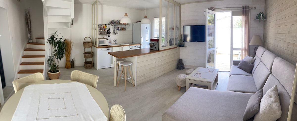 La maison se situe dans un quartier très calme , à quelques pas de l'océan. (500m) Elle est orientée sud , sud-ouest, avec une terrasse sans vis à vis, le jardin donne sur le vignoble. Le stationnement est gratuit et les pistes cyclables sont à proximité . Idéale pour 4 personnes, je propose toutefois d'accueillir 5 personnes , avec soit un couchage supplémentaire pour bébé ( lit parapluie) , soit un couchage supplémentaire dans le séjour . Le ménage de départ est inclus dans le prix .