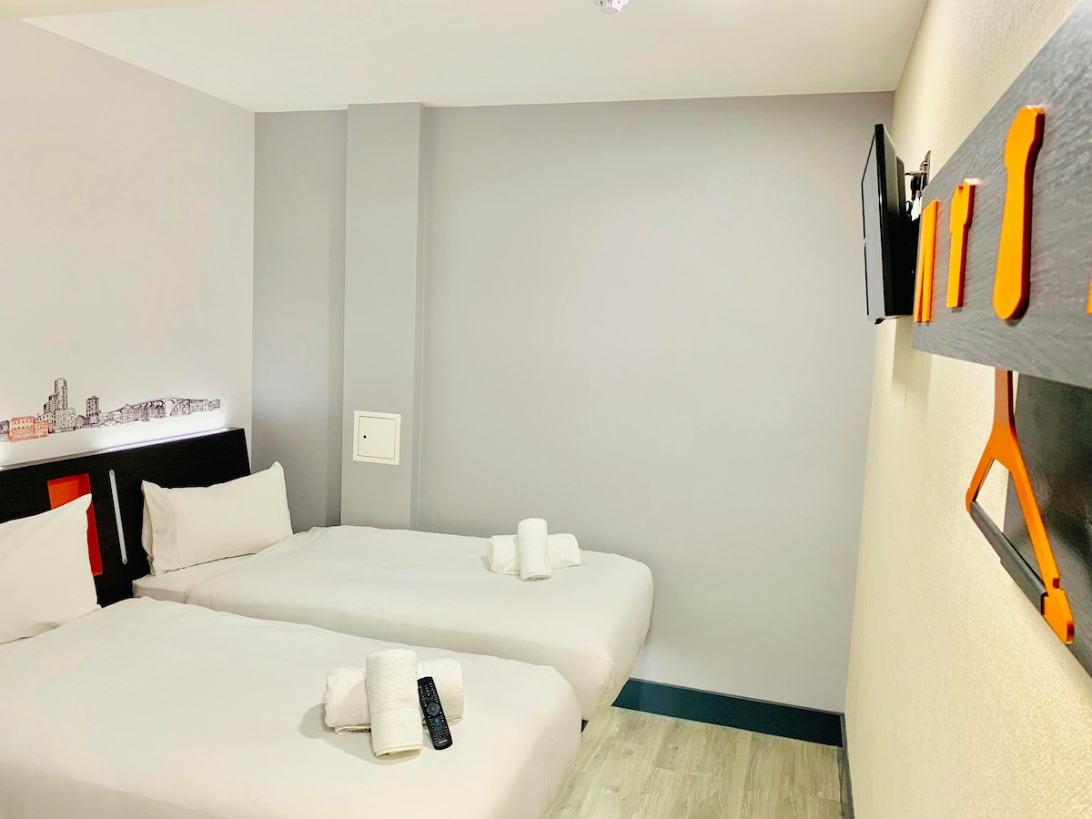 This windowless room with two single beds is compact, smartly designed, and just what you need for a solid night's sleep. Picture this: you, stretching out on a comfy bed with a mattress that's got that four-star feel. And the best part? It's all about getting you great value and keeping things green with our simple, low-carbon approach. The room offers air-conditioning, TV, free Wifi and ensuite bathroom for your comfort. Please note that this is a very small room, size approx. 12sqm.