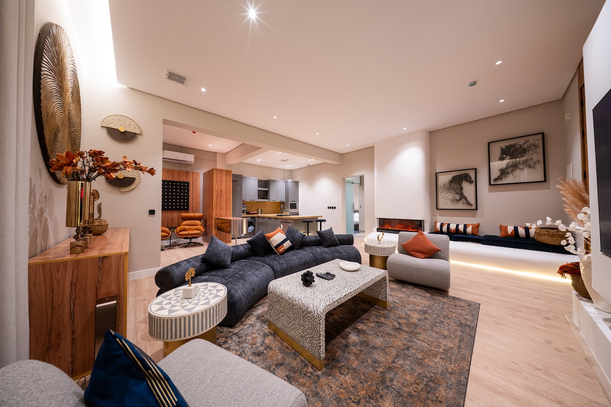 Uživajte u luksuzu u našem elegantno dizajniranom stanu u srcu Rijada. Ovo prostrano utočište ima moderne sadržaje, privatni bioskop i udoban prostor za sjedenje na otvorenom za dvoje. Savršeno za zahtjevne putnike koji traže udobnost i stil. Uživajte u obližnjim atrakcijama, finim restoranima i kupovini, a sve to u neposrednoj blizini. Doživite urbani život u najboljem izdanju sa nama. U blizini Bulevara (~10 min) Aerodrom (~20 min) Wonder Garden (~10 min) KAFD (~10 min) AlBujairi (~15 min)